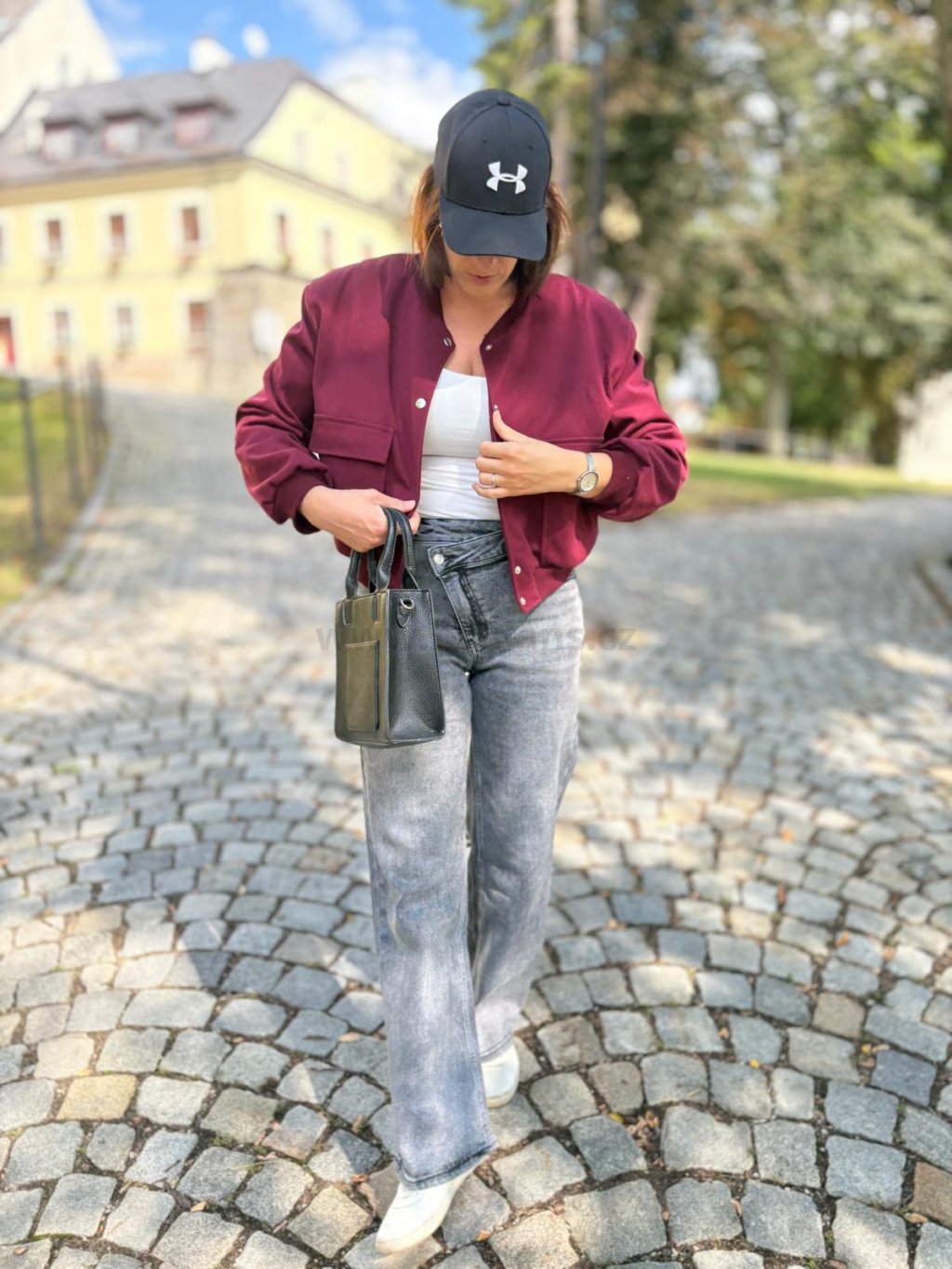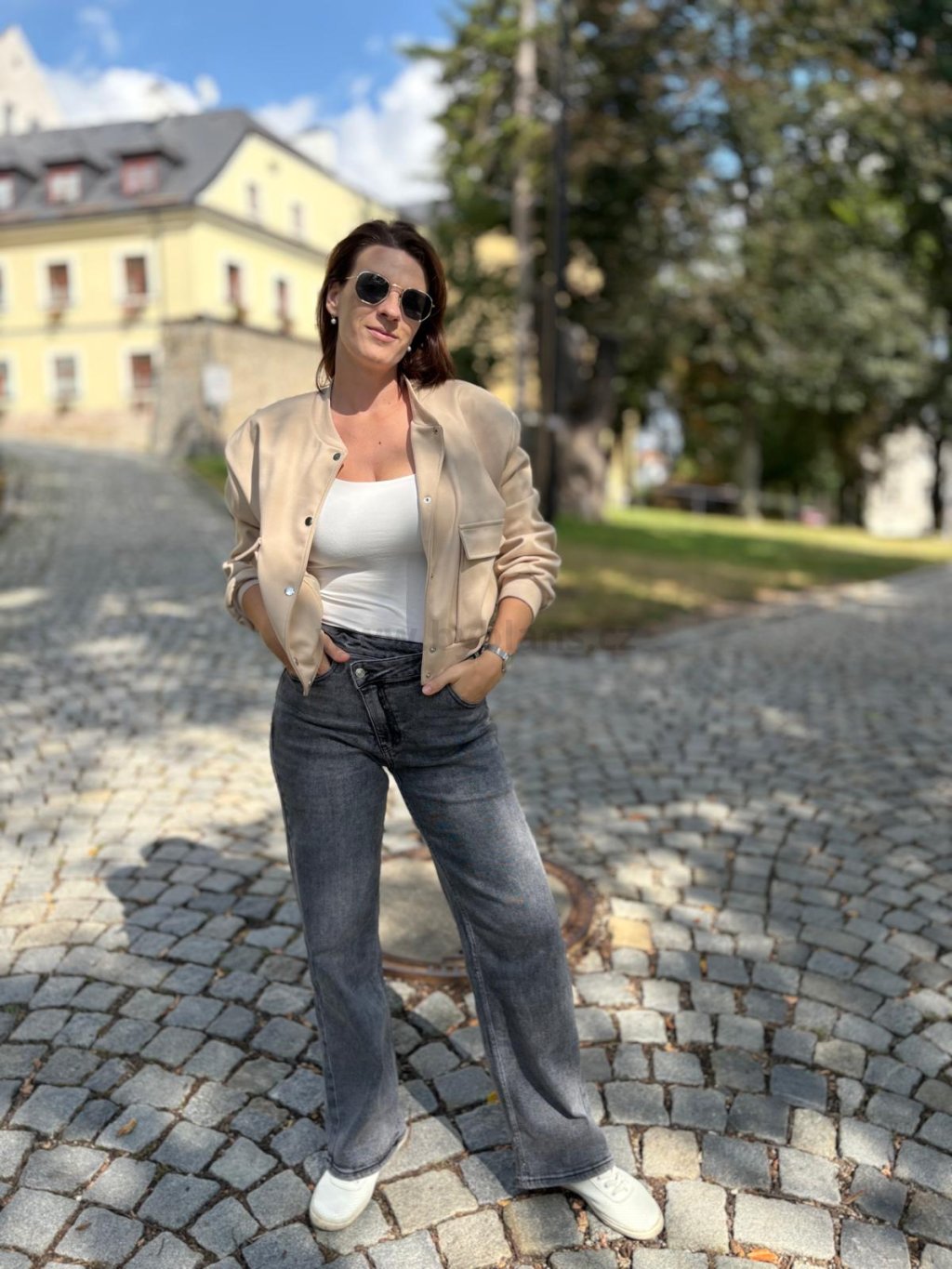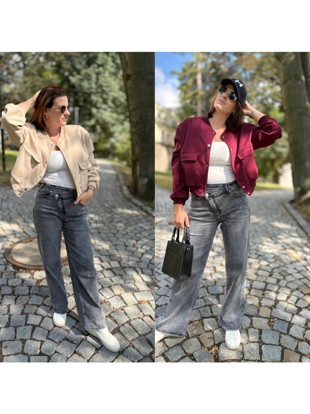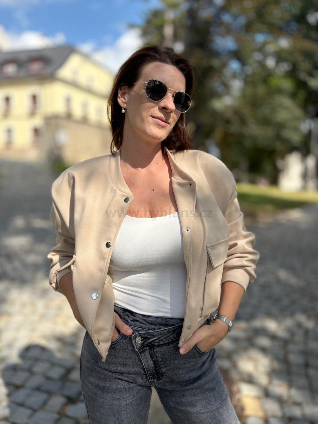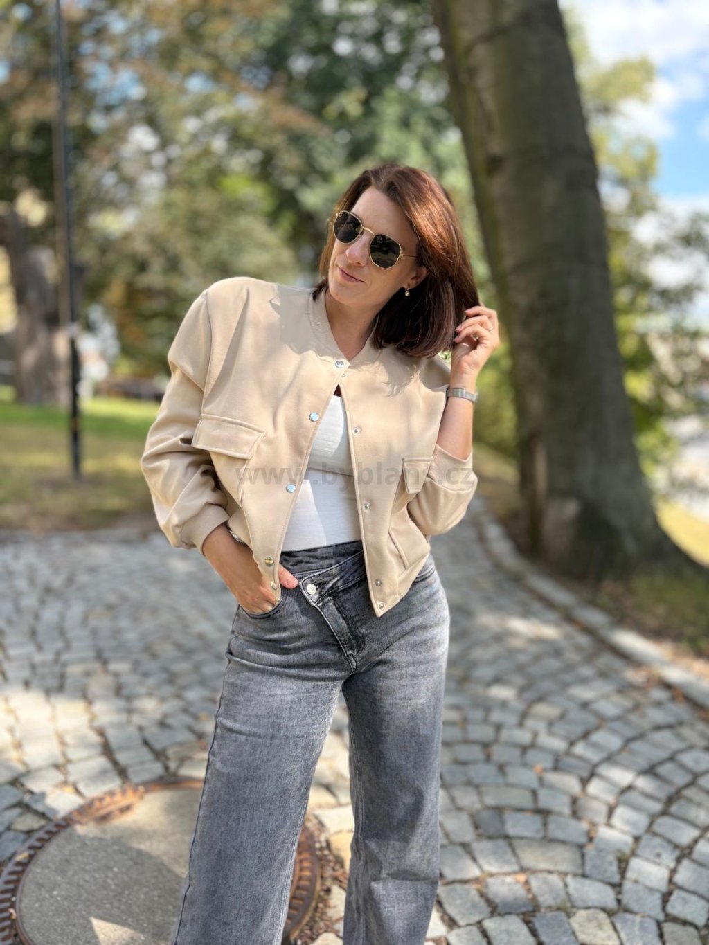 Moderní lehce oversized bomber s vycpávkami v ramenou je výrazným podzimním kouskem, který dodá každému outfitu šmrnc. Velmi příjemný materiál, pohodlně se nosí a zároveň dotváří siluetu. Bomber je podšitý, má praktické kapsy a zapínání na cvoky. V pase je pružný lem. Velikost UNI (sedne na  S – XL (XXL)). Modelka měří 170 cm a běžně nosí velikost M/L.