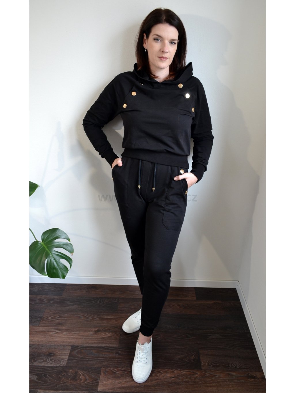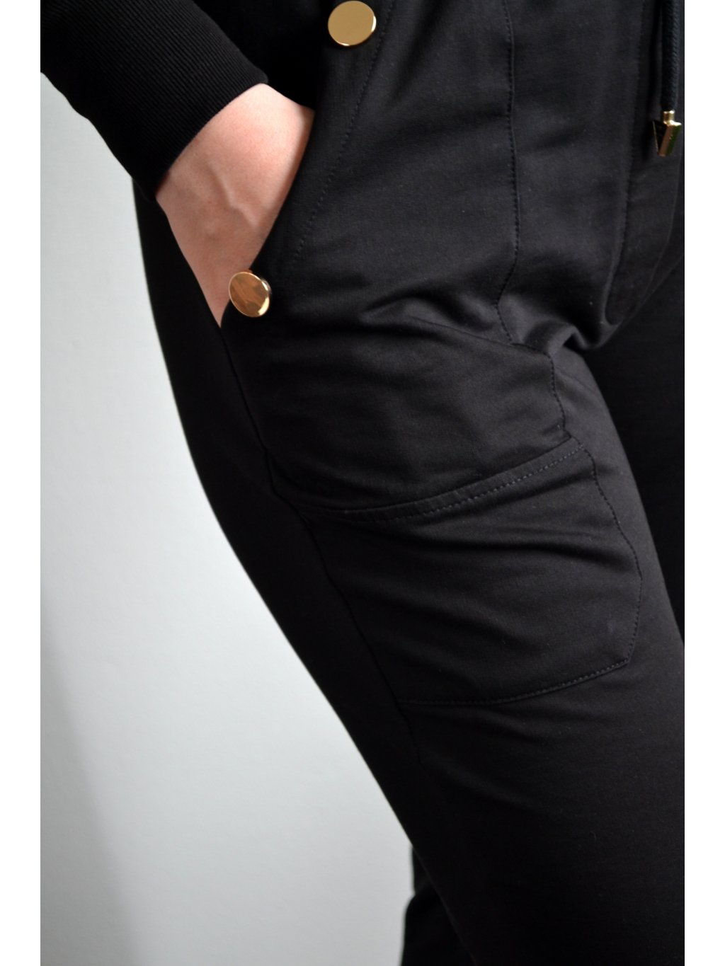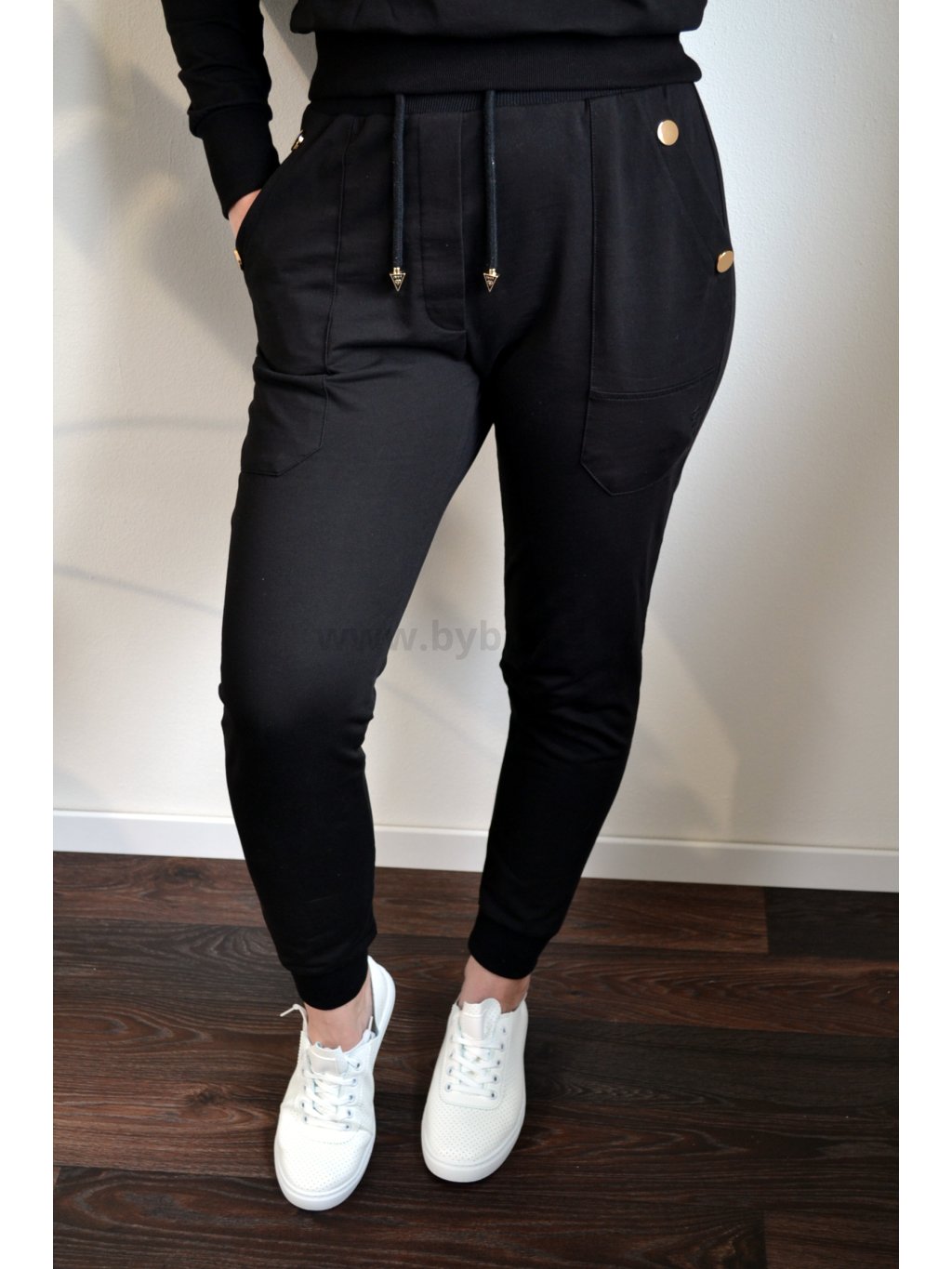 Pohodlné tepláky s vyšším pasem a zlatými decentními cvoky u kapes. V pase je pružná guma a šňůrky na stažení. Příjemný a pružný materiál. Nohavice zakončené žebrováním, tudíž Ti zaručeně sednou! Modelka měří 170 cm a běžně nosí velikost M/L.