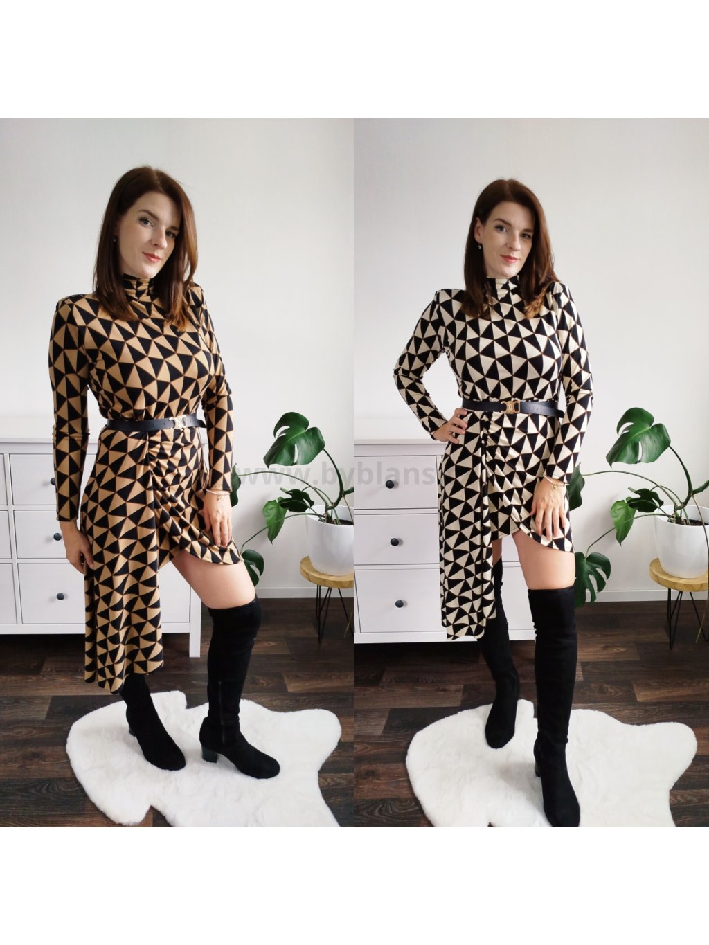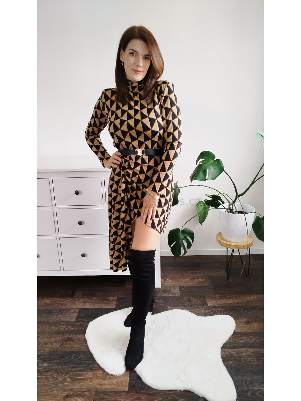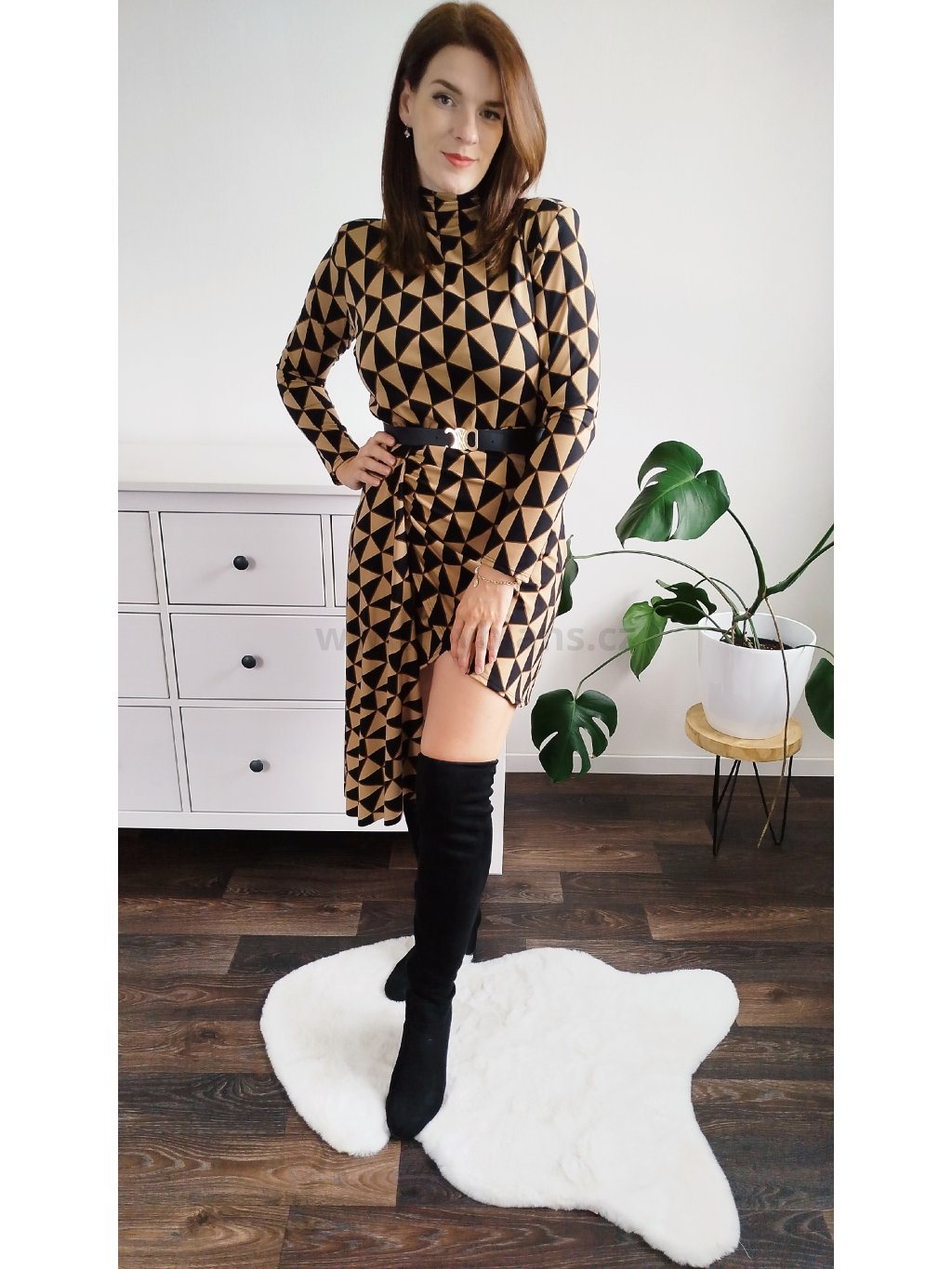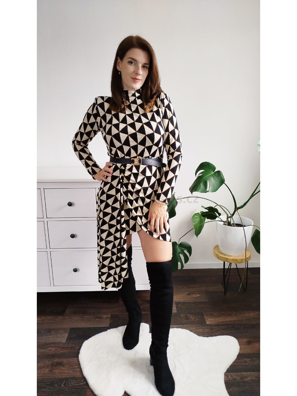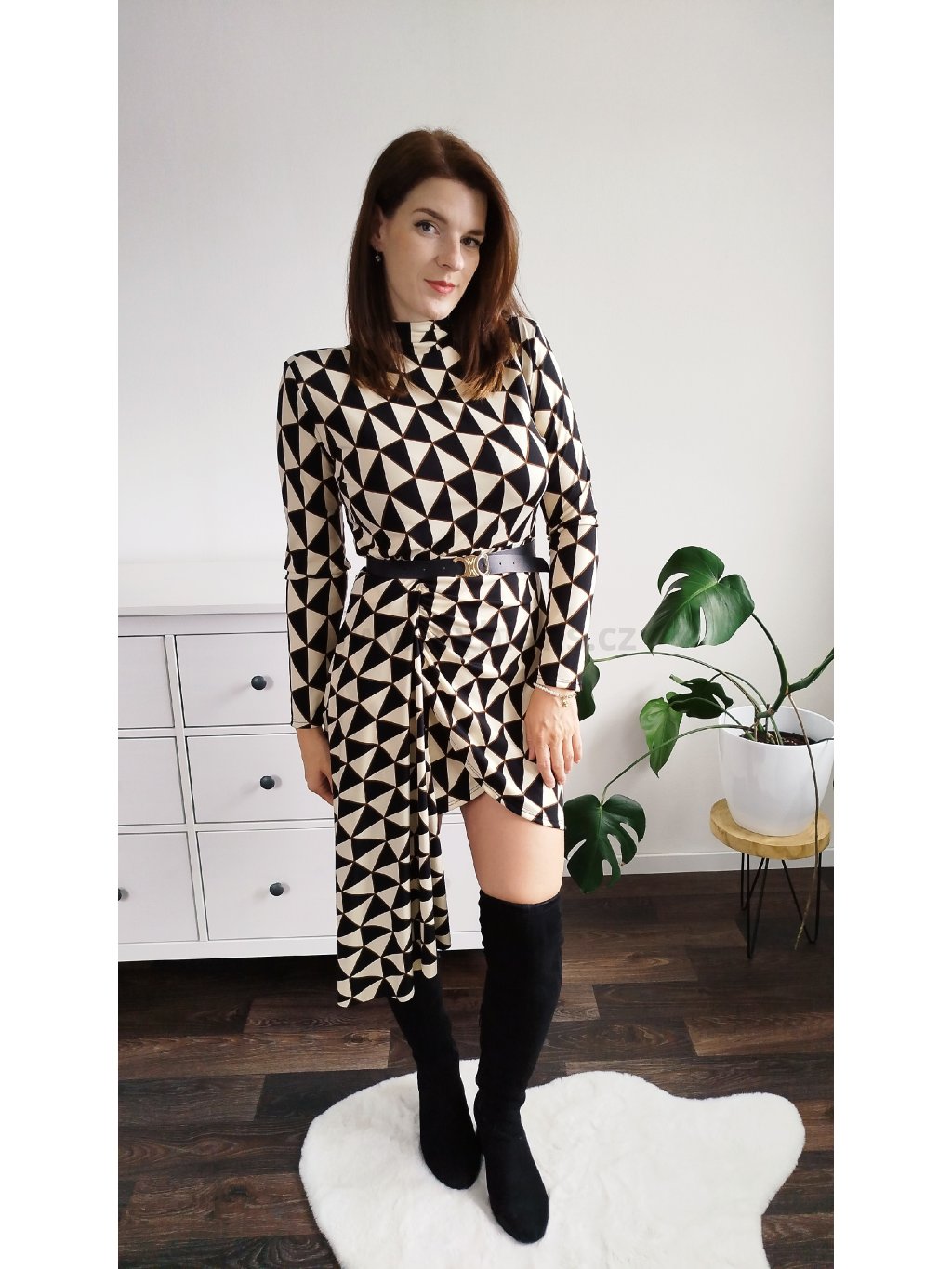 Asymetrické šaty se vzory. Originální kousek, který zaujme! Vhodné například na večírek. Šaty mají krátký stojáček u krku a vycpávky v ramenou. Velikost UNI (sedne na XS - L). Modelka měří 170 cm a běžně nosí velikost M/L.