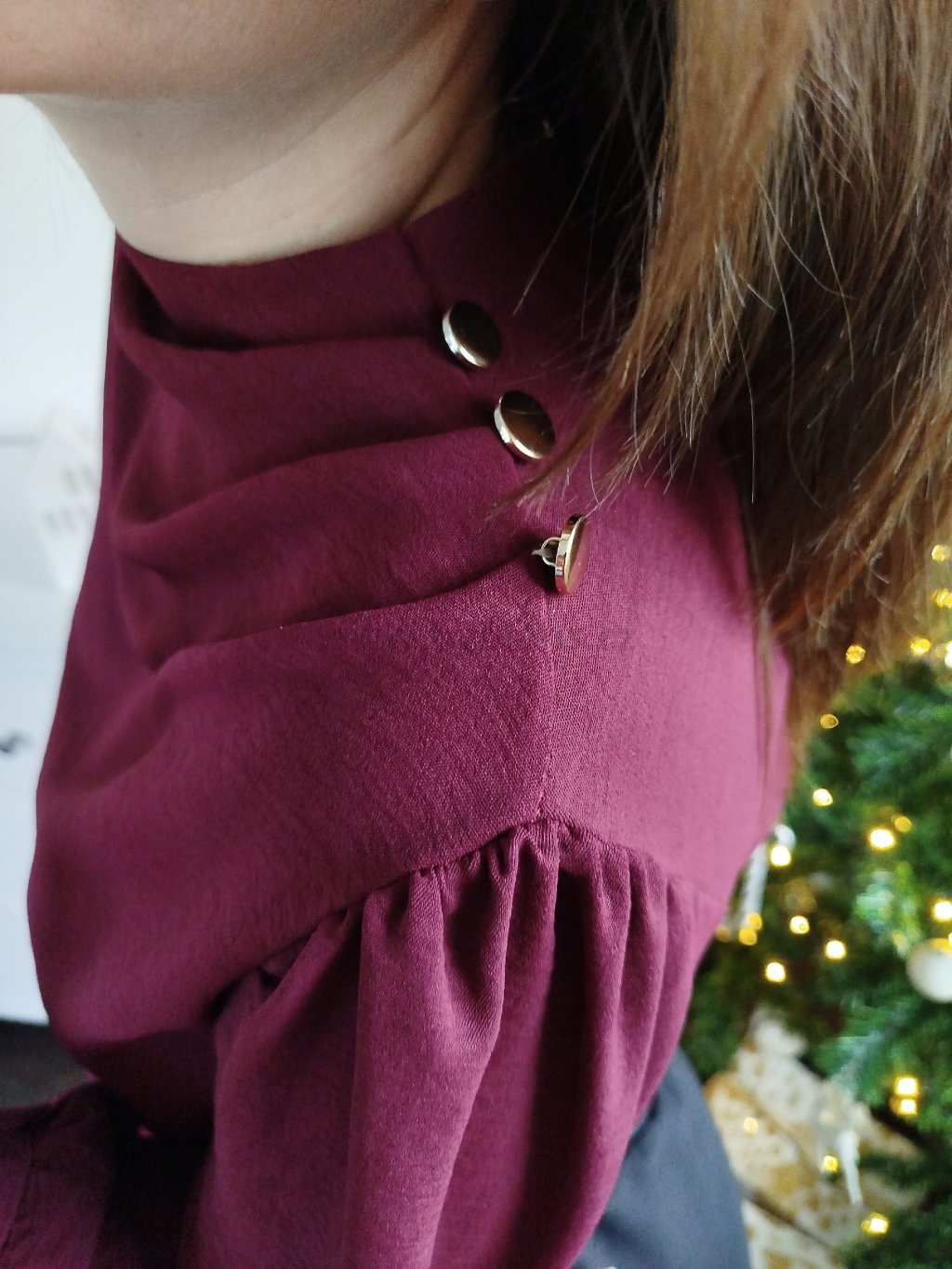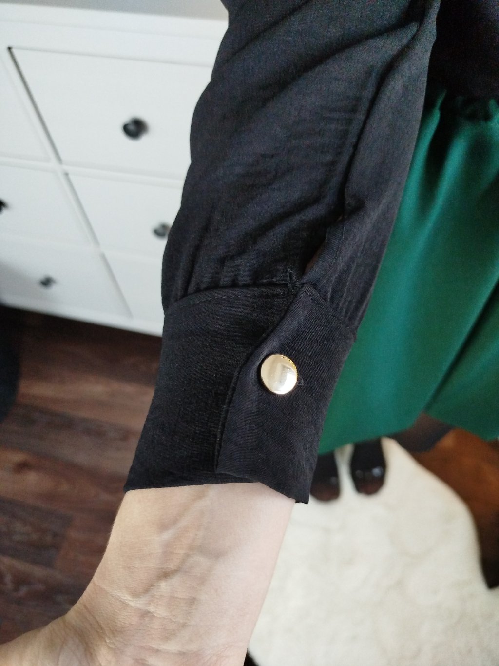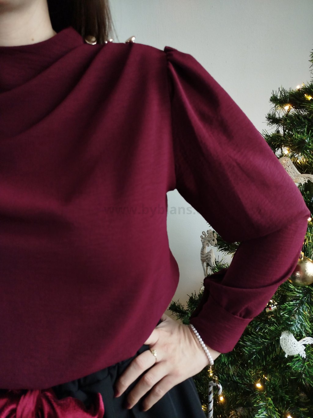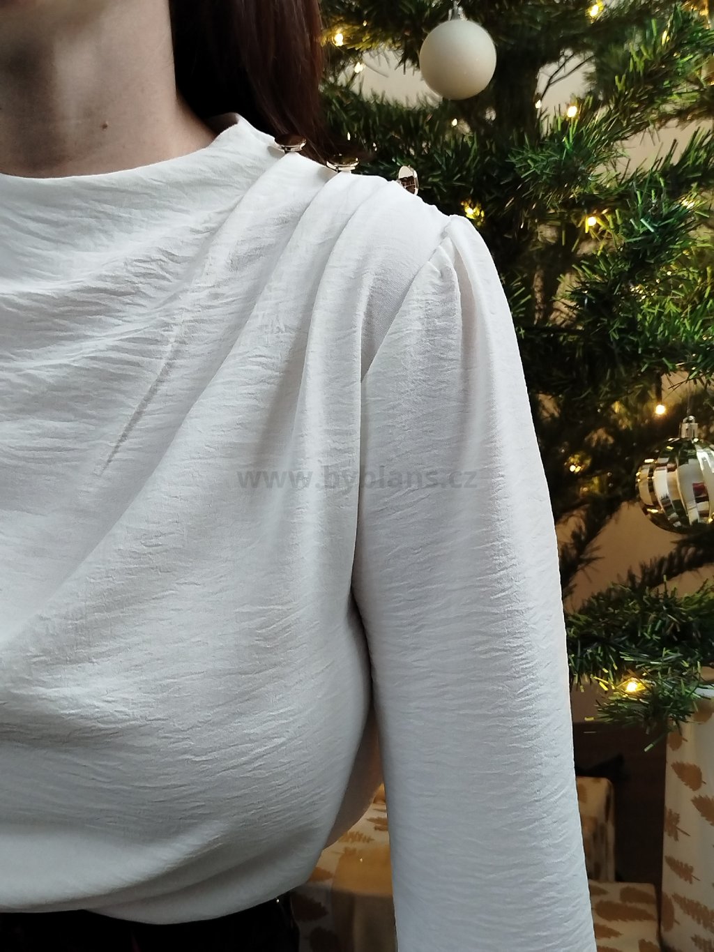 Elegantní halenku s dlouhými nařasenými rukávy zdobí zlaté cvočky na jednom rameni. Zapínání na zlatý knoflík je i na zápěstí a za krkem. Dekolt ozvláštňuje "voda". U krku je mírný stojáček. Halenka je z lehkého materiálu, mírně pruží. Variabilní kousek, který vynosíš v mnoha outfitech.