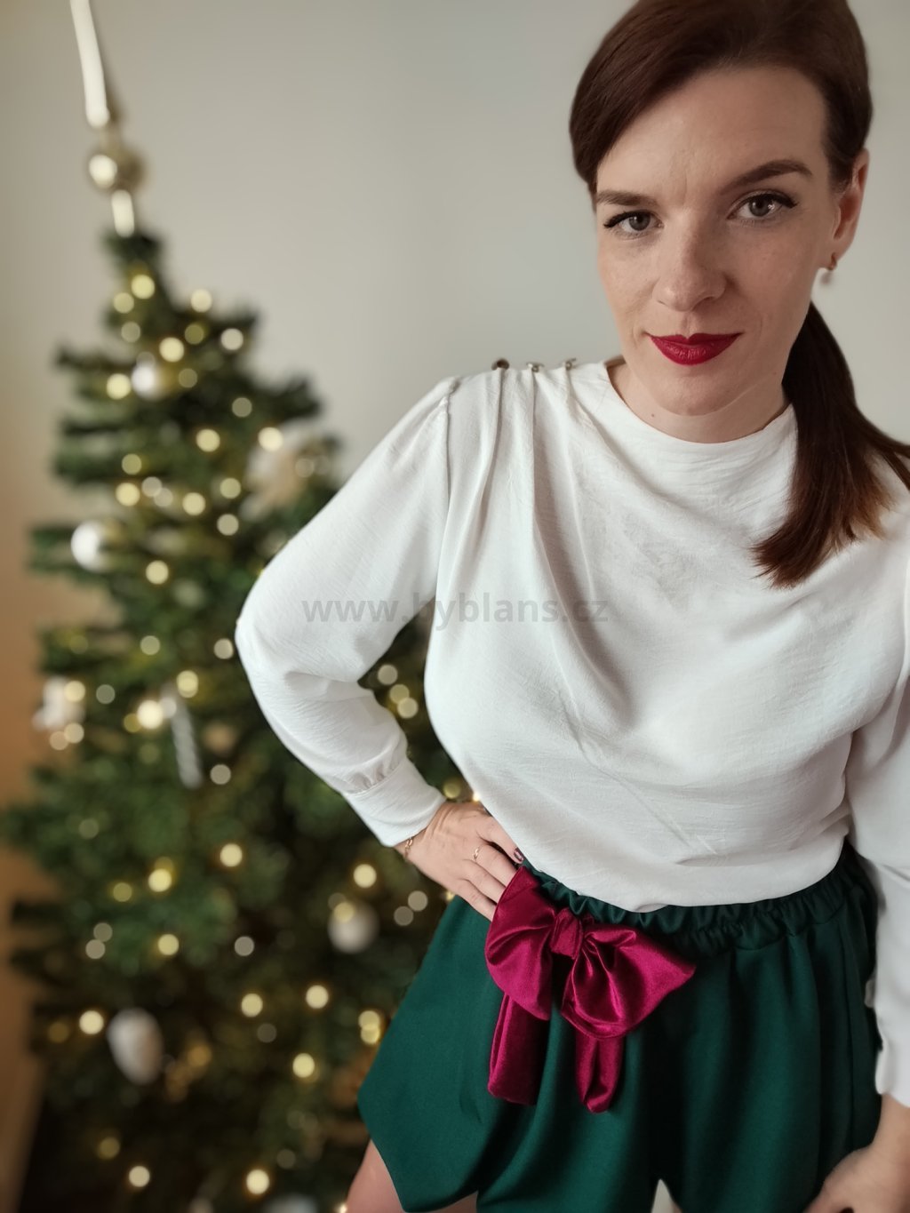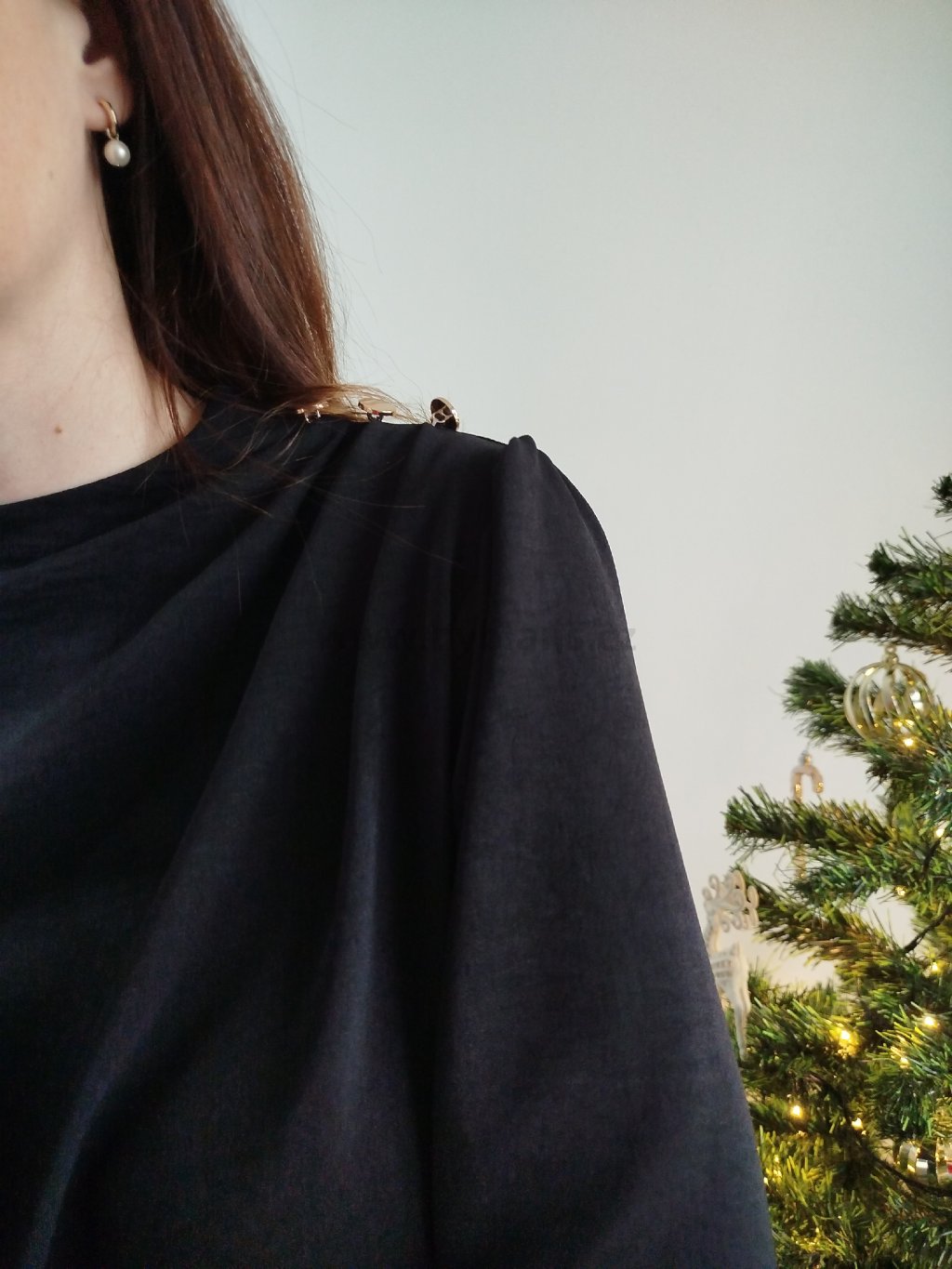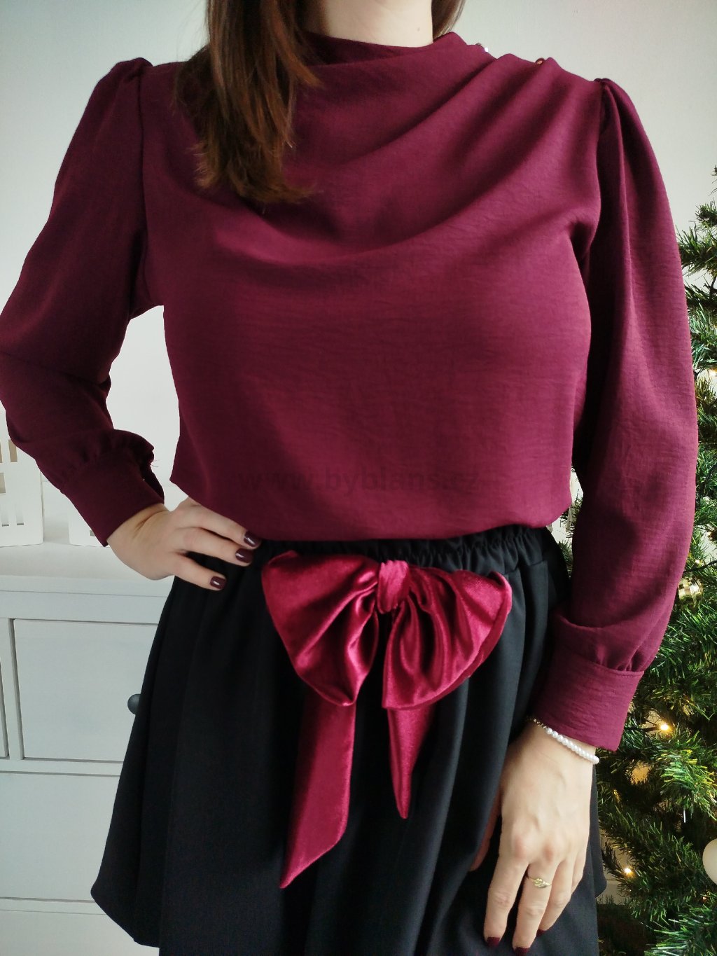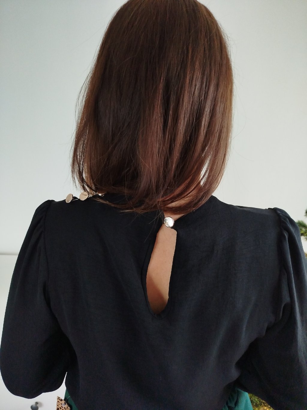 Elegantní halenku s dlouhými nařasenými rukávy zdobí zlaté cvočky na jednom rameni. Zapínání na zlatý knoflík je i na zápěstí a za krkem. Dekolt ozvláštňuje "voda". U krku je mírný stojáček. Halenka je z lehkého materiálu, mírně pruží. Variabilní kousek, který vynosíš v mnoha outfitech.