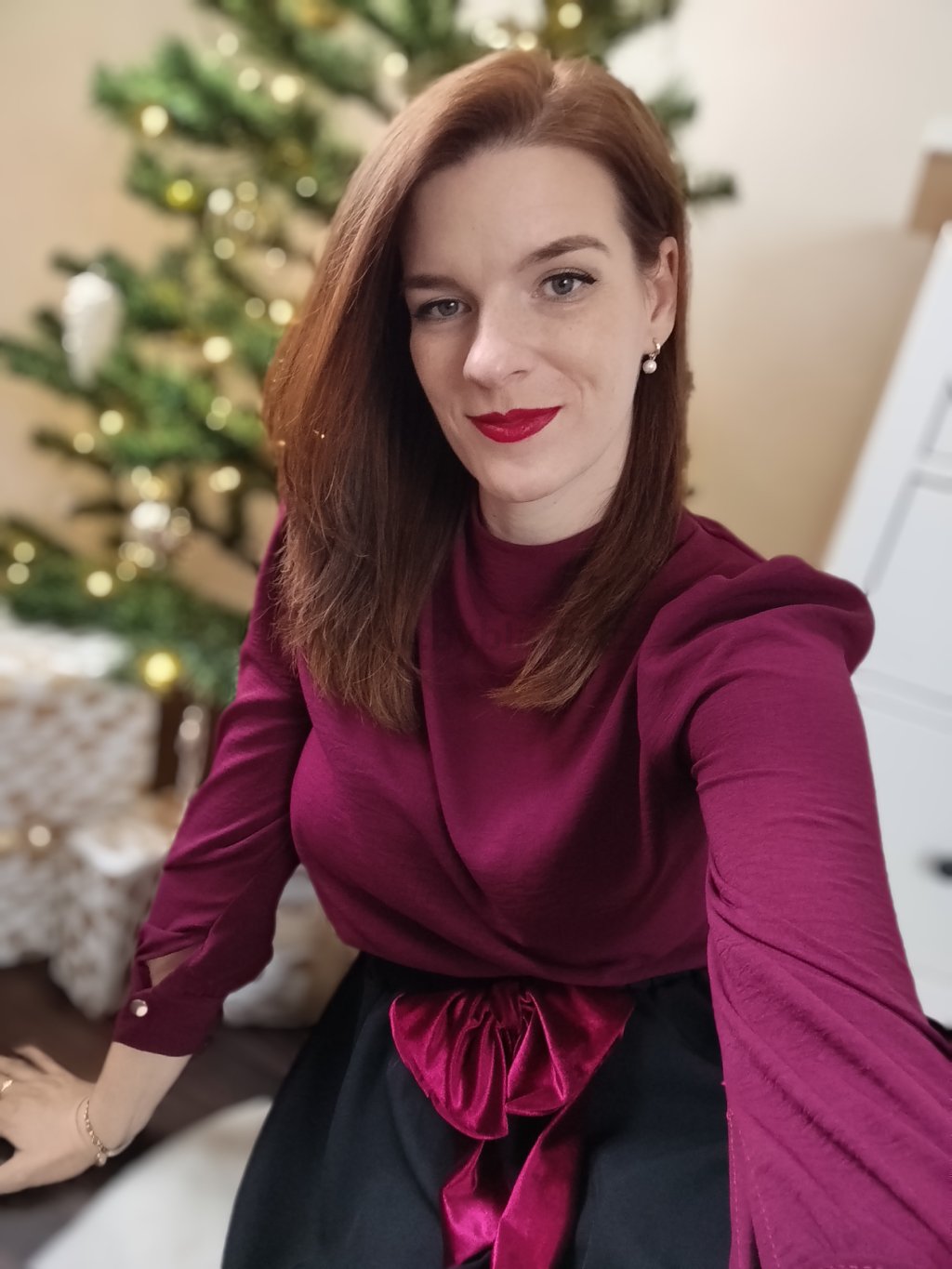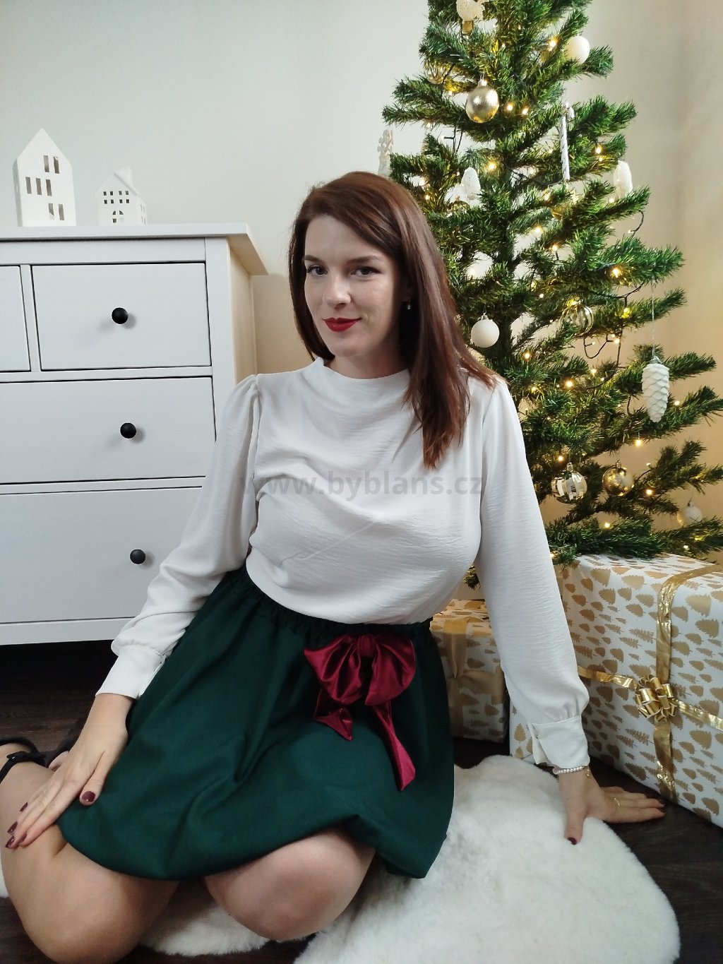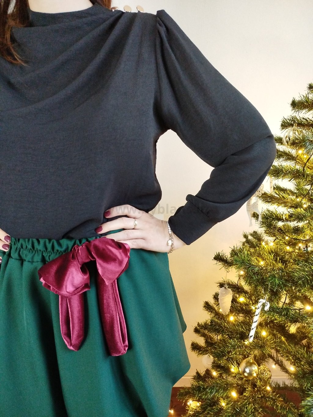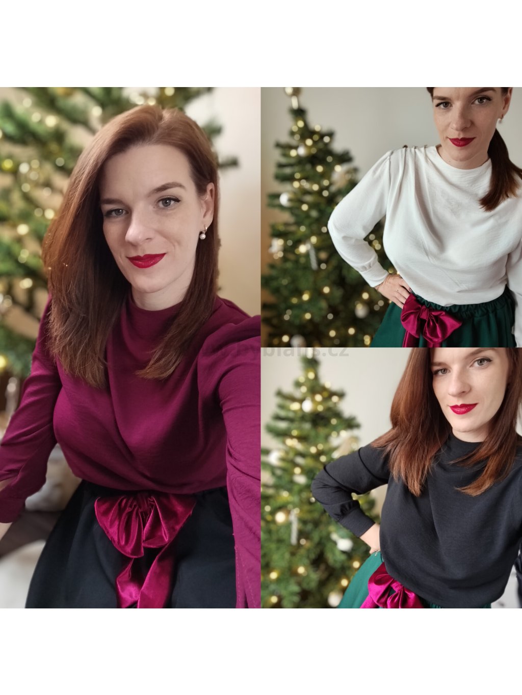 Elegantní halenku s dlouhými nařasenými rukávy zdobí zlaté cvočky na jednom rameni. Zapínání na zlatý knoflík je i na zápěstí a za krkem. Dekolt ozvláštňuje "voda". U krku je mírný stojáček. Halenka je z lehkého materiálu, mírně pruží. Variabilní kousek, který vynosíš v mnoha outfitech.