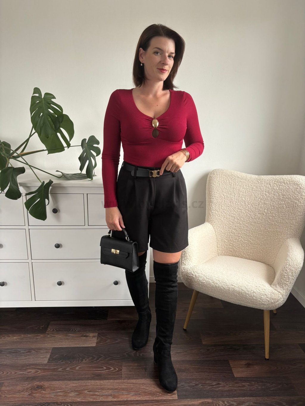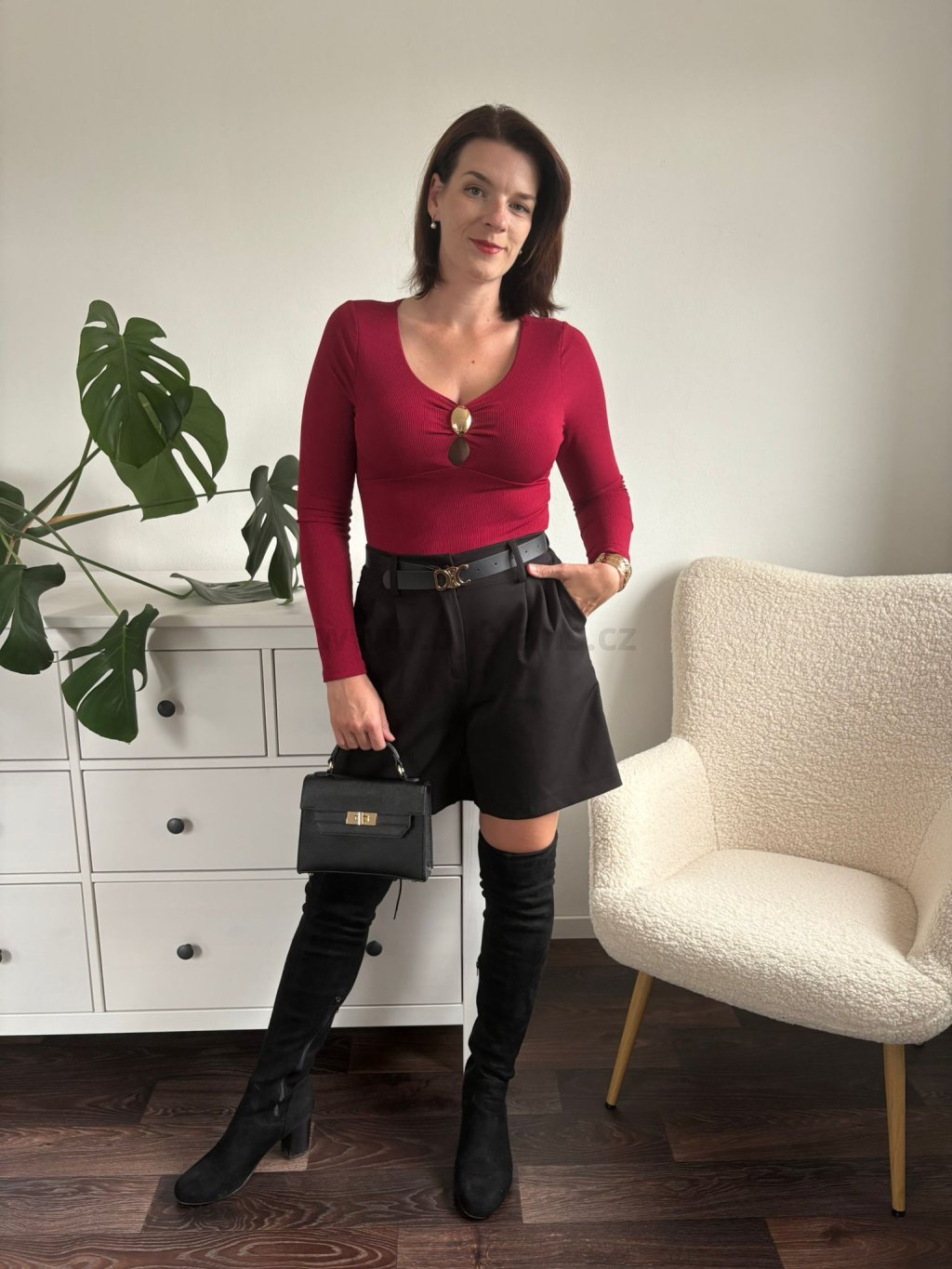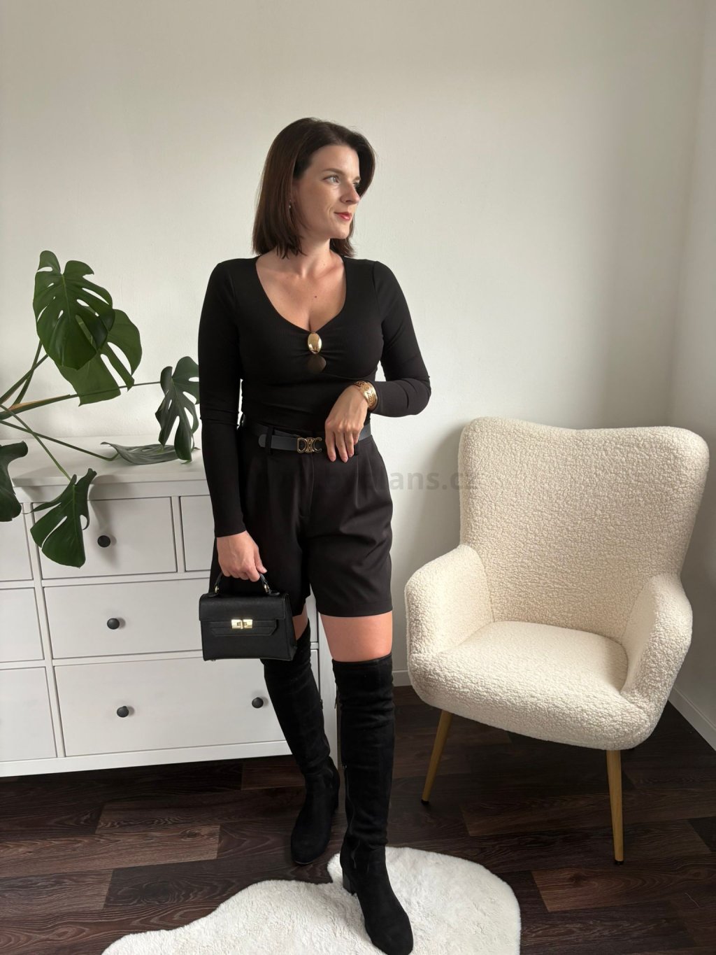 Přiléhavá halenka s výstřihem do V, která dokonale podtrhne ženské křivky. V oblasti dekoltu je průstřih se zlatou dekorací. Na prsou jsou vycpávky, díky nimž se budeš cítit sebevědomě i bez podprsenky. Univerzální střih se snadno kombinuje s kalhotami, sukní i šortkami. Perfektní kousek pro každodenní nošení i elegantní styling. Velikost UNI (sedne na XS - M). Modelka měří 170 cm a běžně nosí velikost M/L.