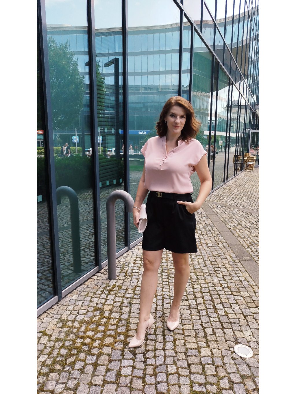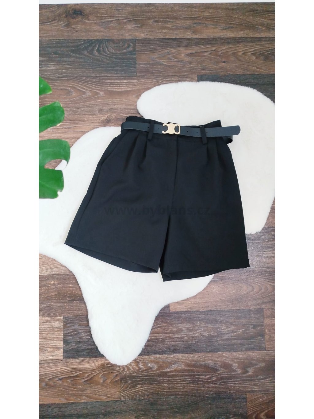 Vyšší elegantní kostýmkové kraťasy s páskem v černé barvě. Volný sofistikovaný styl. Modelka měří 170 cm a běžně nosí velikost M/L.