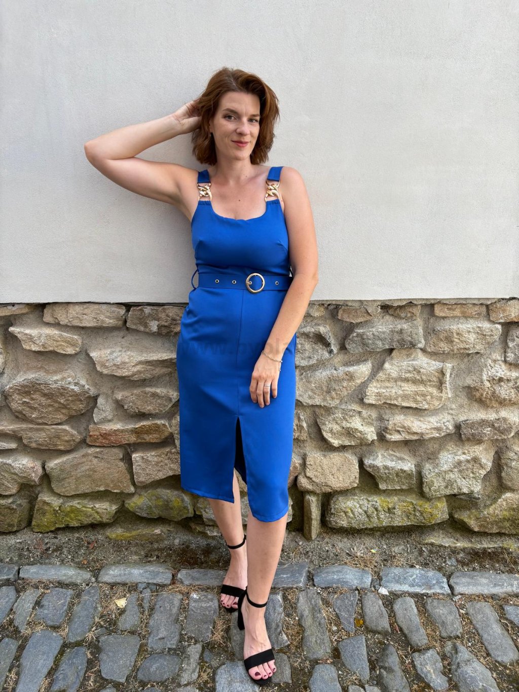 Elegantní šaty na ramínka. Ramínka jsou zdobená zlatým řetízkem. Ve spodní části je rozparek. Šaty jsou pružné, vzadu na žabičkování. Velikost UNI (sedne na XS - M). Modelka měří 172 cm a běžně nosí velikost S/M.
