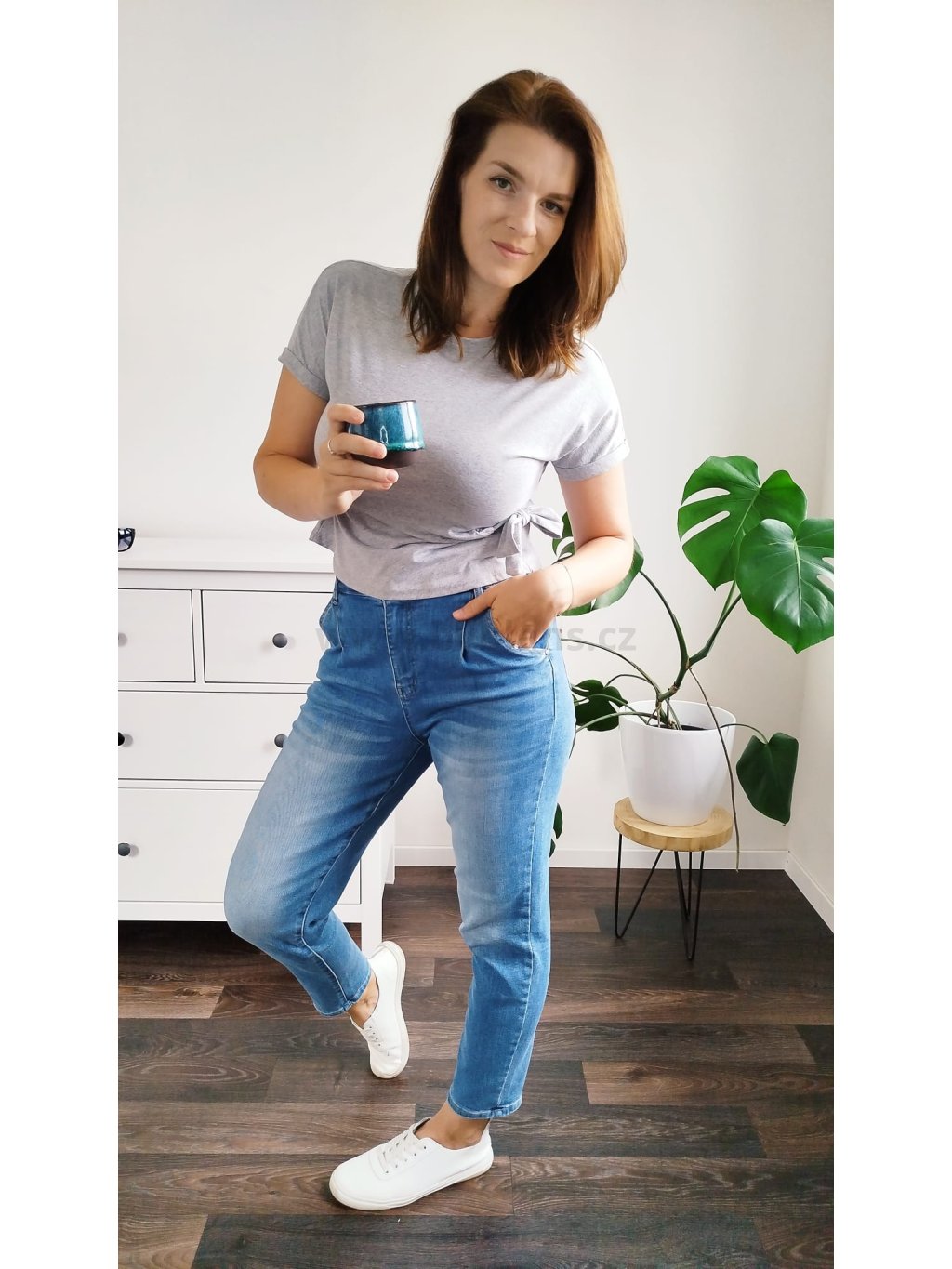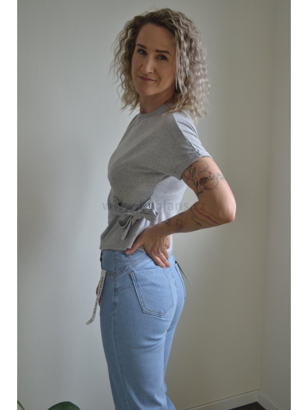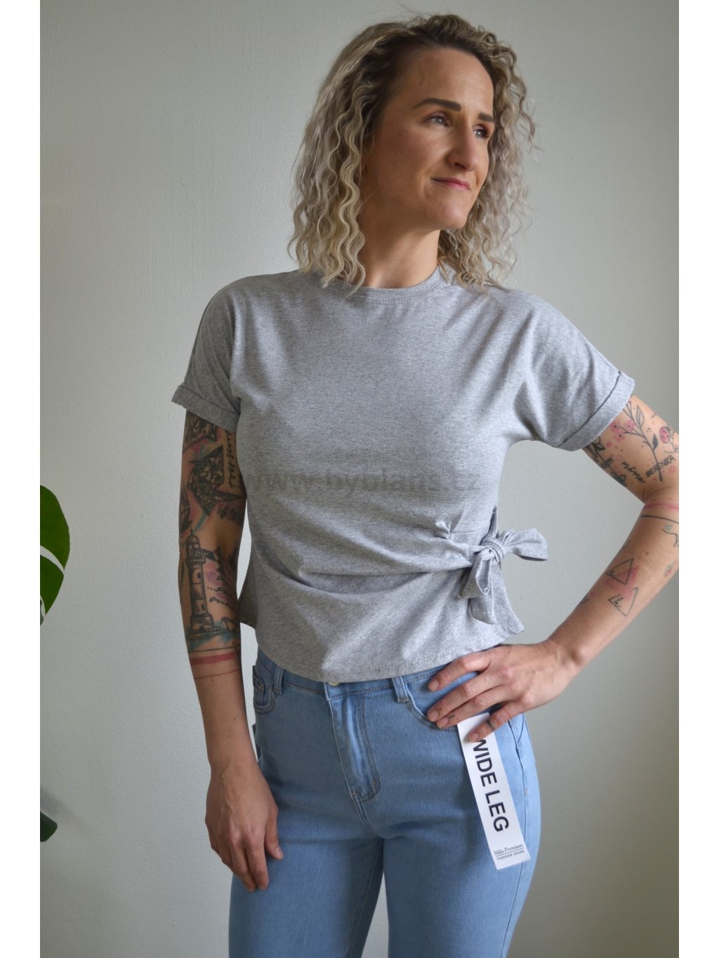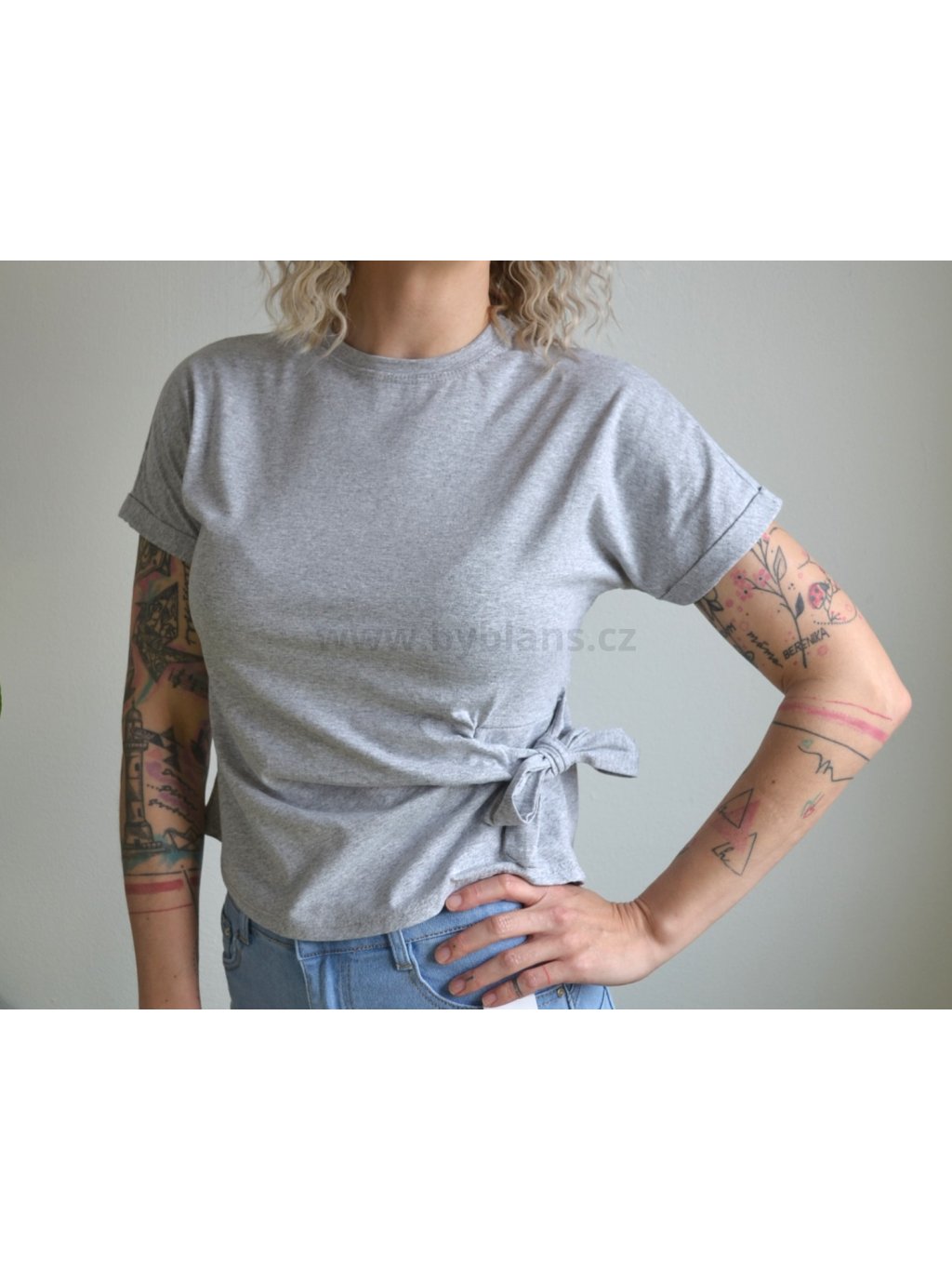 Kratší top s mašlí v basic šedé barvě. Skvěle padne k vyšším kalhotám. Velikost UNI (sedne na XS – menší L). Modelka měří 172 cm a běžně nosí velikost S/M.