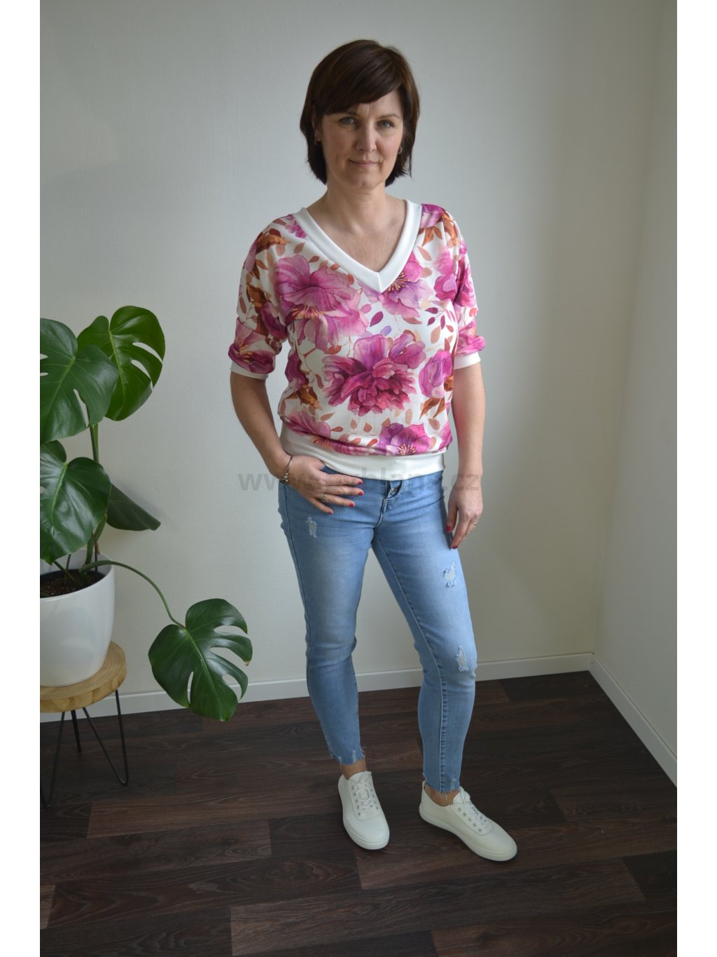 Zářivá květovaná halenka s výstřihem do V. Oživ svůj šatník tímto originálním kouskem! Velikost UNI (sedne na XS – XL). Modelka měří 168 cm a běžně nosí velikost M/L.