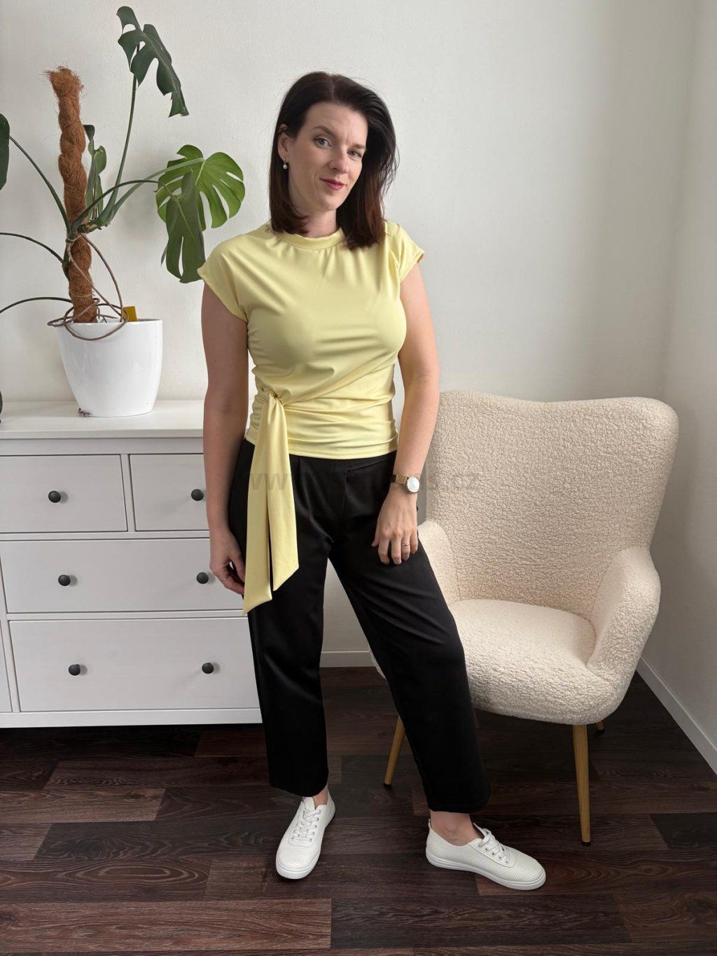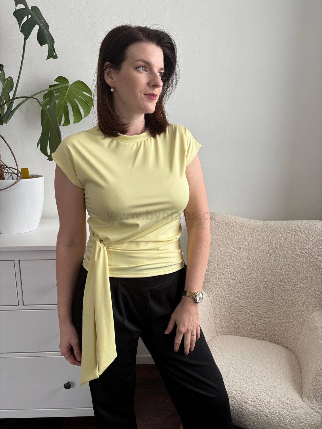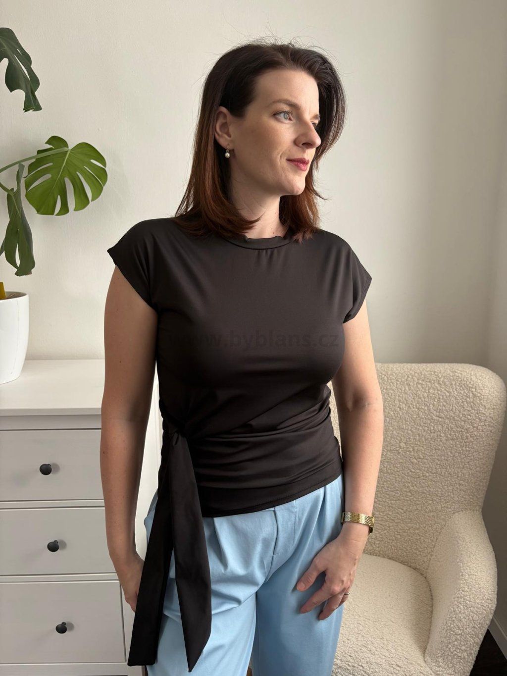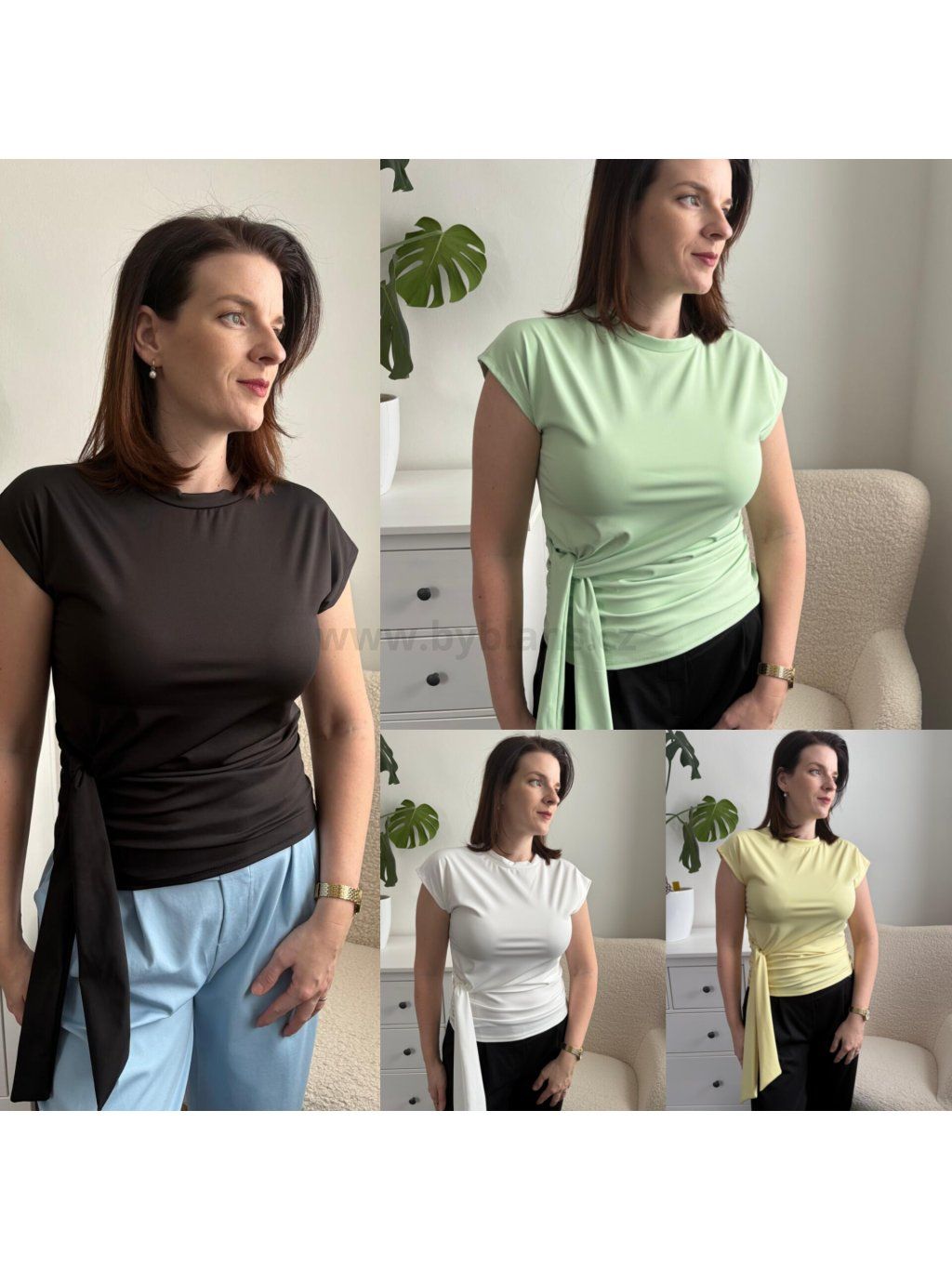 Pružné dámské tričko s originálním šikmým vázáním. Vázání jde nosit jednoduše převázané nebo lze uvázat elegantní mašle. Variabilní kousek, který vynosíš ke všemu. Velikost UNI (sedne na XS – M). Modelka měří 170 cm a běžně nosí velikost M/L.