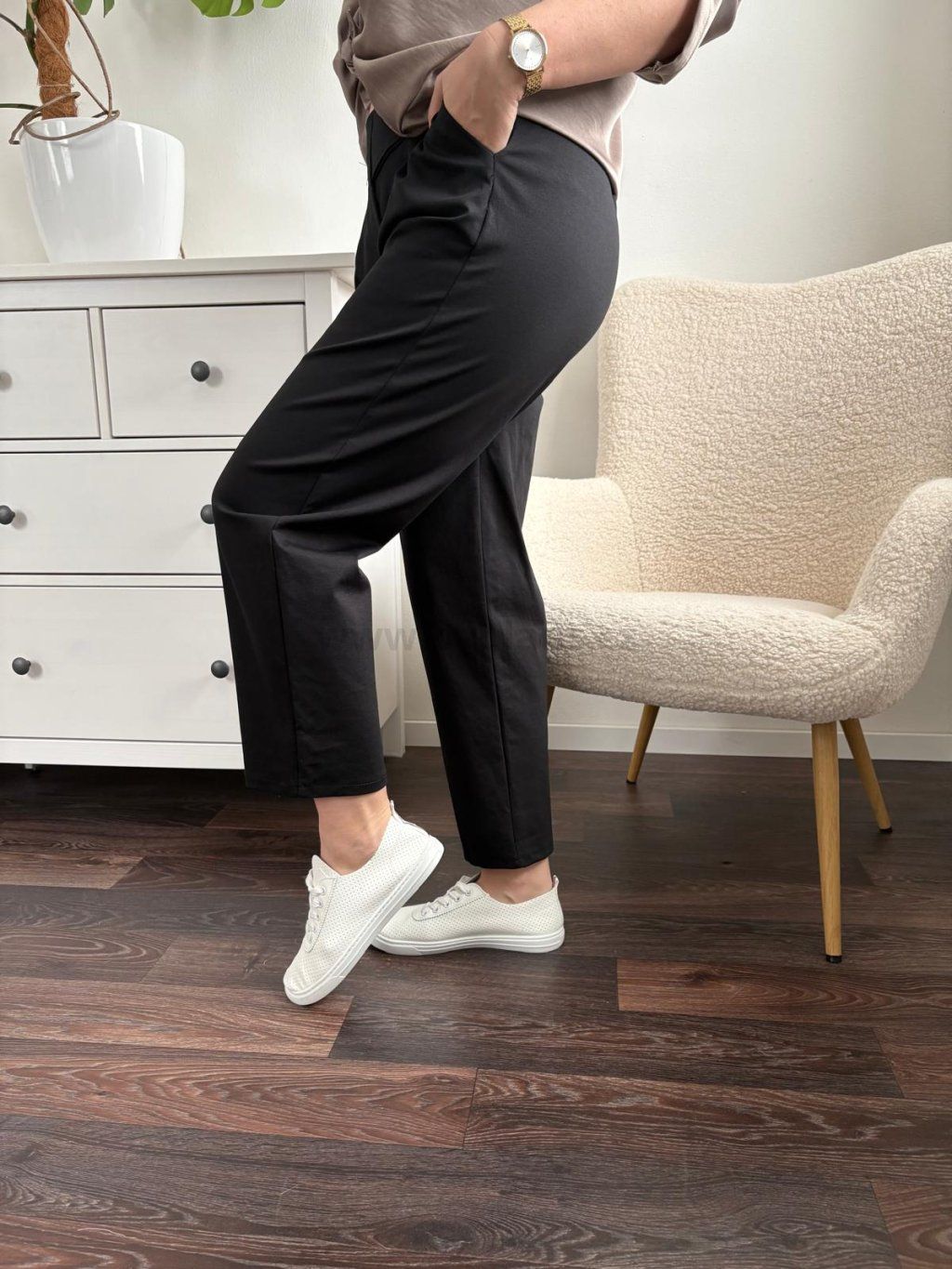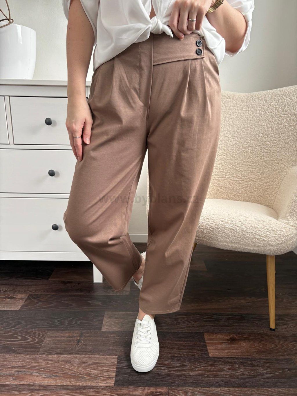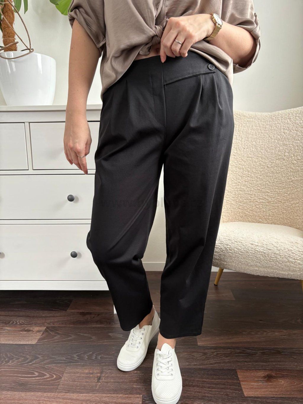 Volnočasové dámské kalhoty s vyšším pasem jsou vhodné na jaro/léto. Volnější střih lichotí postavě a kvalitní materiál ti zajistí pohodlí po celý den. Variabilní kousek, který vynosíš ke všemu. Nohavice se dají i zahnout. Velikost UNI (sedne na M - XL). Modelka měří 170 cm a běžně nosí velikost M/L.